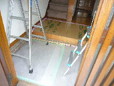 着工前に床タイルを傷つけないよう、汚さないよう、丹念にポリベニヤで養生を致します
